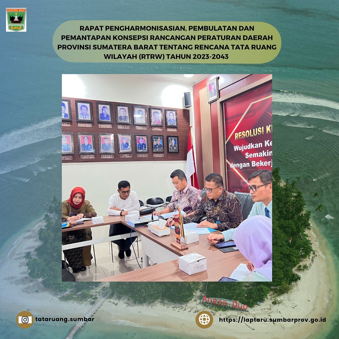 Pemerintah Provinsi Sumatera Barat telah melakukan Rapat Pengharmonisasian, Pembulatan dan Pemantapan Konsepsi Rancangan Peraturan Daerah Provinsi Sumatera Barat tentang Rencana Tata Ruang Wilayah (RTRW) Tahun 2023 - 2043 dengan Kantor Wilayah Kementerian Hukum dan Hak Asasi Manusia Provinsi Sumatera Barat pada Jumat, 19 Mei 2023. Pemerintah Provinsi Sumatera Barat diwakili oleh Dinas Bina Marga, Cipta Karya dan Tata Ruang selaku OPD Pemrakarsa, Dinas Sumber Daya Air dan Bina Konstruksi, Dinas Kelautan dan Perikanan, Dinas Perhubungan, Dinas Lingkungan Hidup, Dinas Energi dan Sumber Daya Mineral, Dinas Kehutanan, dan Biro Hukum.