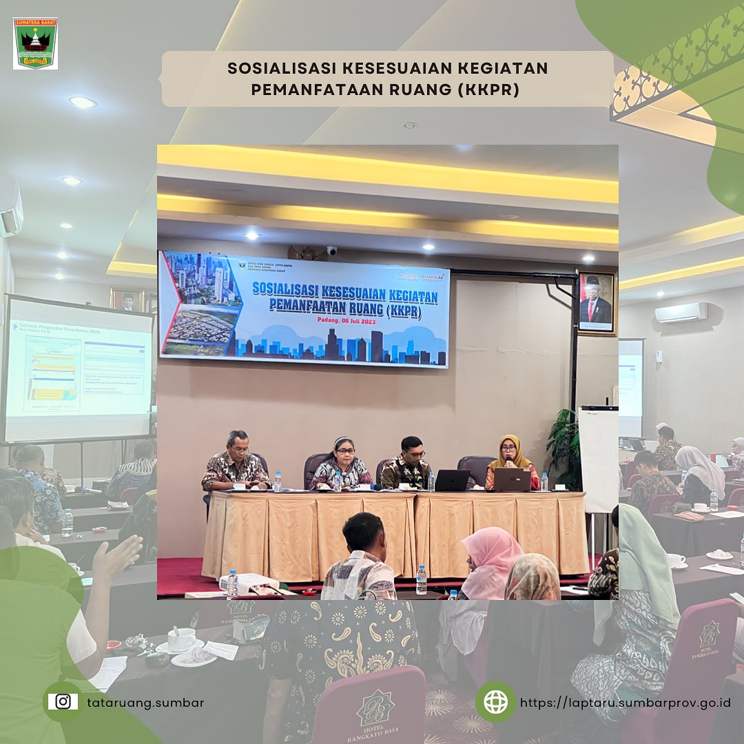 Bidang Tata Ruang Dinas BMCKTR Provinsi Sumatera Barat telah melaksanakan Kegiatan Sosialisasi Kesesuaian Kegiatan Pemanfaatan Ruang (KKPR) Tahun 2023, pada Kamis, 06 Juli 2023. Sosialisasi dihadiri oleh perwakilan dari Dinas Lingkungan Hidup Provinsi Sumatera Barat, Dinas ESDM Provinsi Sumatera Barat, Kantor Wilayah BPN Provinsi Sumatera Barat, Perwakilan Dinas PUPR dan Dinas PMPTSP Kabupaten/Kota di Lingkungan Pemerintah Provinsi Sumatera Barat. Dalam sosialisasi tersebut, hadir para Narasumber dari Direktorat Sinkronisasi Pemanfaatan Ruang, Kementerian ATR/BPN, yaitu Ibu Nenden Mauliani, ST dan dari Direktorat Perencanaan Jasa dan Kawasan, Kementerian Investasi/Badan Koordinasi Penanaman Modal yaitu Bapak Yoga Adhi Pratama, ST, M.C.R.P.